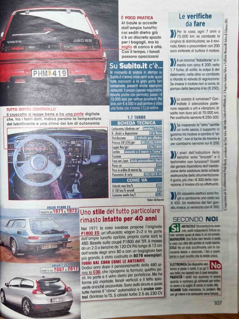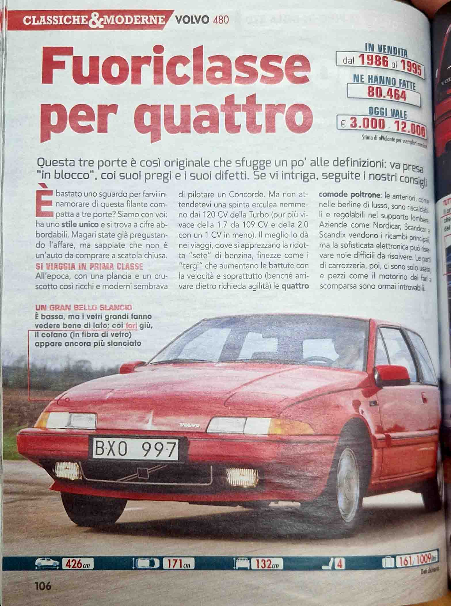 L’articolo sulla Volvo 480 nella rubrica “Consigli per l’Acquisto – Classiche & Moderne” del mensile