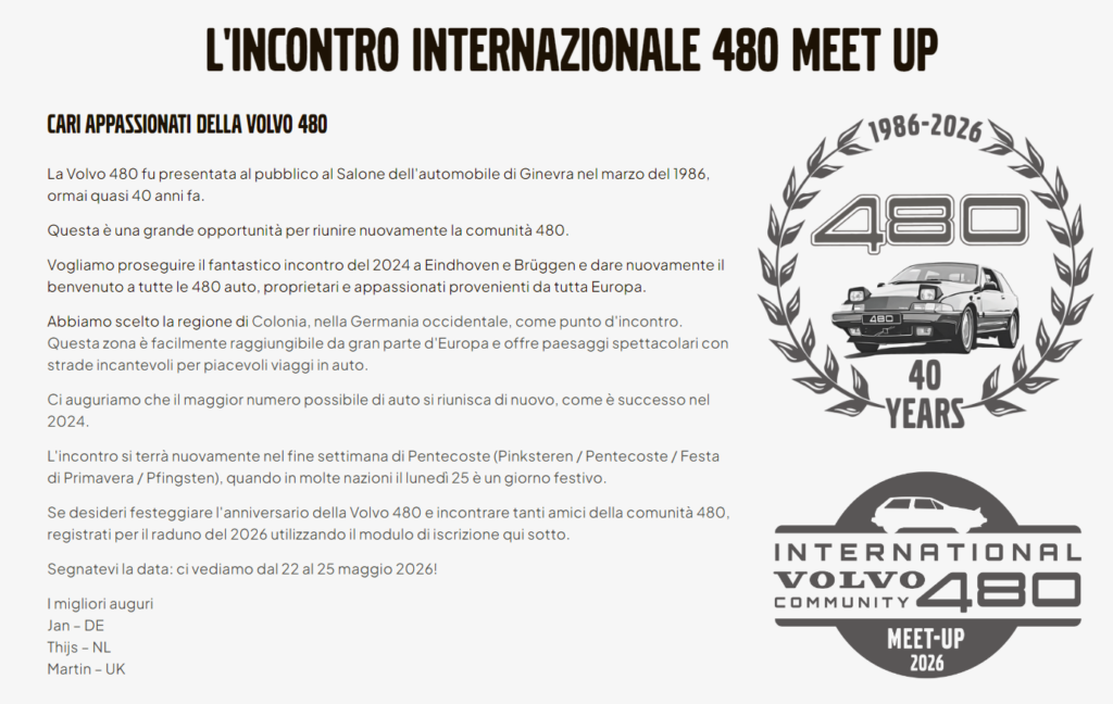 oggi è un giorno speciale. Dopo anni di attesa, di raccolta paziente di materiali, immagini, ricordi e testimonianze, il nuovo sito e progetto www.clubvolvo480italia.it sta finalmente prendendo vita. È un momento che abbiamo desiderato, immaginato e costruito insieme, passo dopo passo.